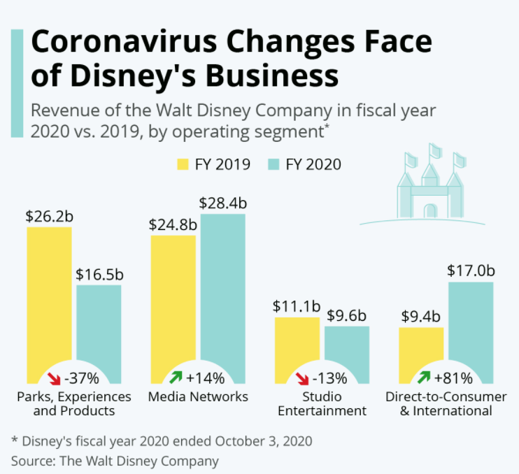 디즈니의 스트리밍 사업인 디즈니 플러스는 2020년 대부분의 기간 동안 구독자 수가 증가하며 회사 주식의 상승을 견인했다. 미래의 스트리밍 수익에 매료된 투자자들은 완전한 경제 셧다운에도 불구하고 회사 주식에 돈을 쏟아 부었다.