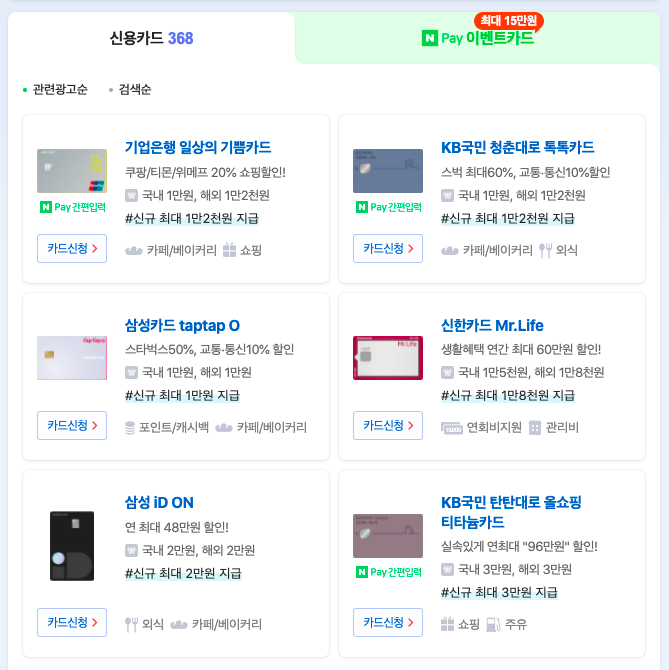 신용카드는 종류가 무척이나 다양하다. 네이버에 검색했을 때 368건이나 나올 정도다. 신용카드 대부분은 연회비라는 개념이 있고, 혜택도 천차만별이다. 보통 통신비 교통비를 할인해주거나 온라인쇼핑, 주유비, 비행기 표 등을 할인해주는 카드도 있다.