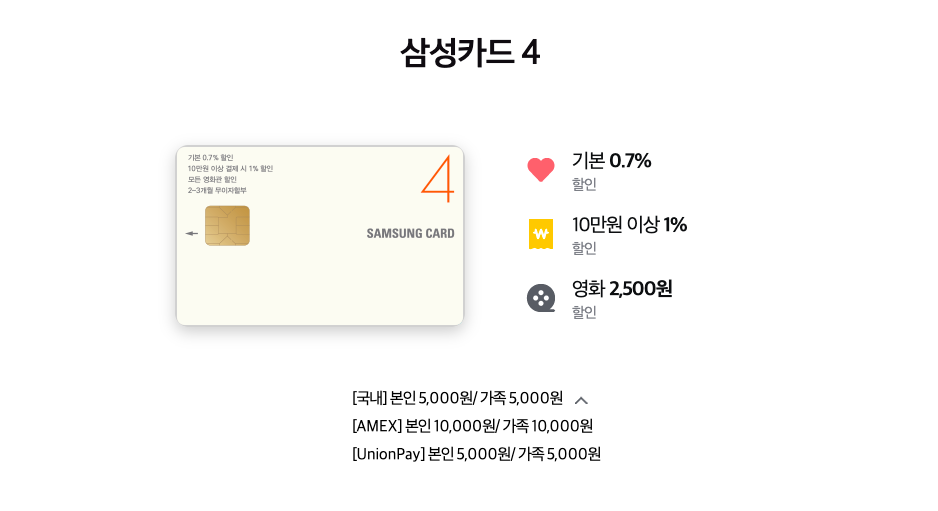 삼성카드4를 추천하는 이유는 0.7%의 기본 캐시백이 적용된다는 점이다. 0.7%의 폭이 작아보이지만, 식비, 통신비, 교통비, 쇼핑 어디에나 적용된다는 점을 감안한다면, 굉장히 실용적인 혜택이라고 생각한다. 한달 생활비로 100만원만 사용해도 연간 82,000원이 할인되는 것이니, 연회비를 넘는 혜택을 누릴 수 있다. 또한 가맹점 3개월 무이자 할부도 실용적인 혜택 중 하나이다. 큰 액수의 소비를 할 때 이자비용을 줄일 수 있기 때문이다. 이러한 혜택들은 '소비한다는 가정 하에' 누릴 수 있는 혜택이 아니라 '내 소비 패턴 안에서 누릴 수 있는 혜택'이기 때문이란 것이 장점이다.