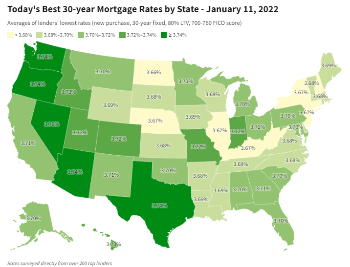 2022년 1월 11일 기준으로, Benchmark 30년 고정 모기지 이자율은 3.70%, FHA 30년 고정 이자율은 3.66%, 점보 30년 고정 모기지 이자율은 3.44%이다. 15년 고정은 2.85%, 5/1 ARM은 3.28%이다.