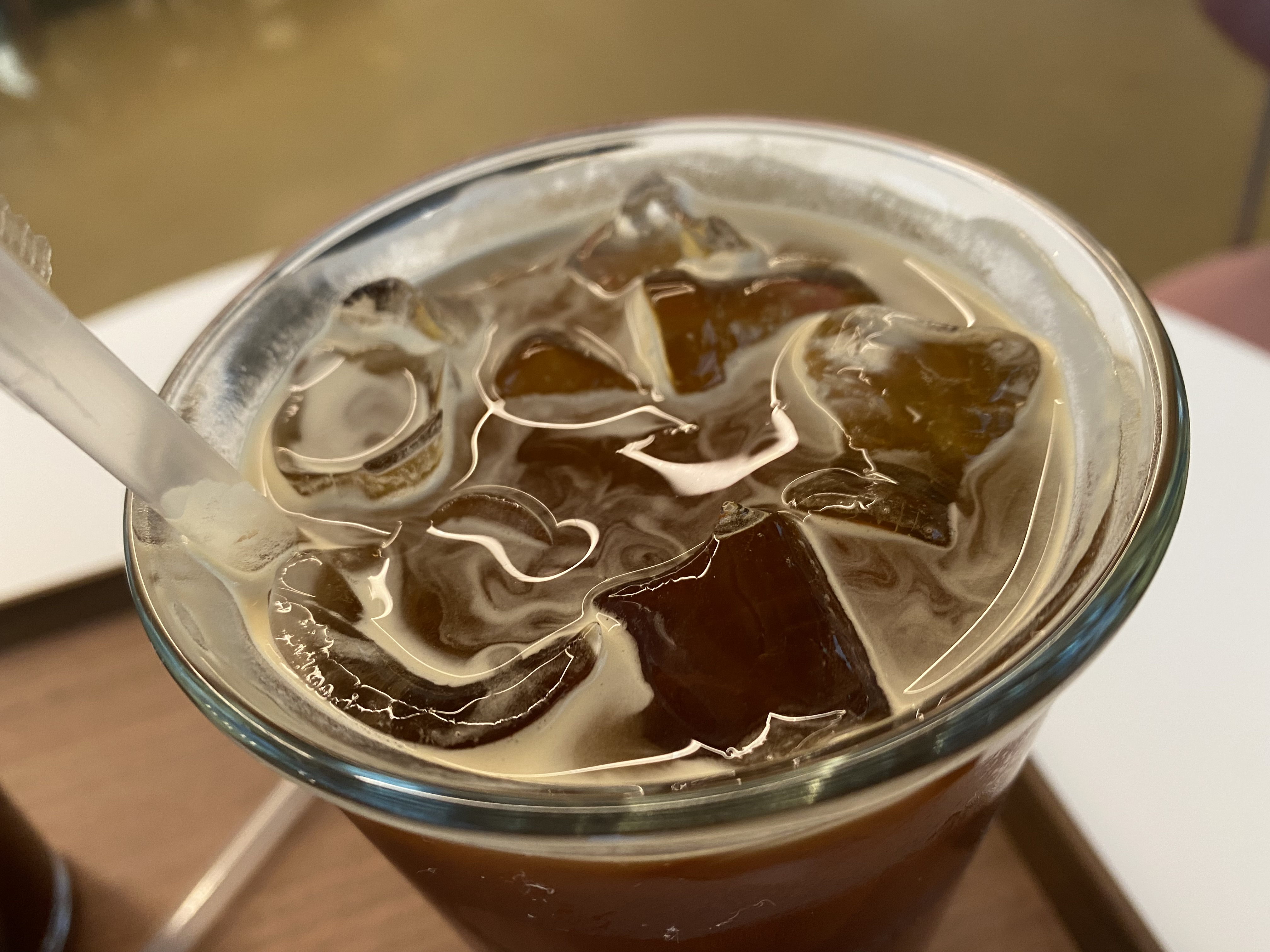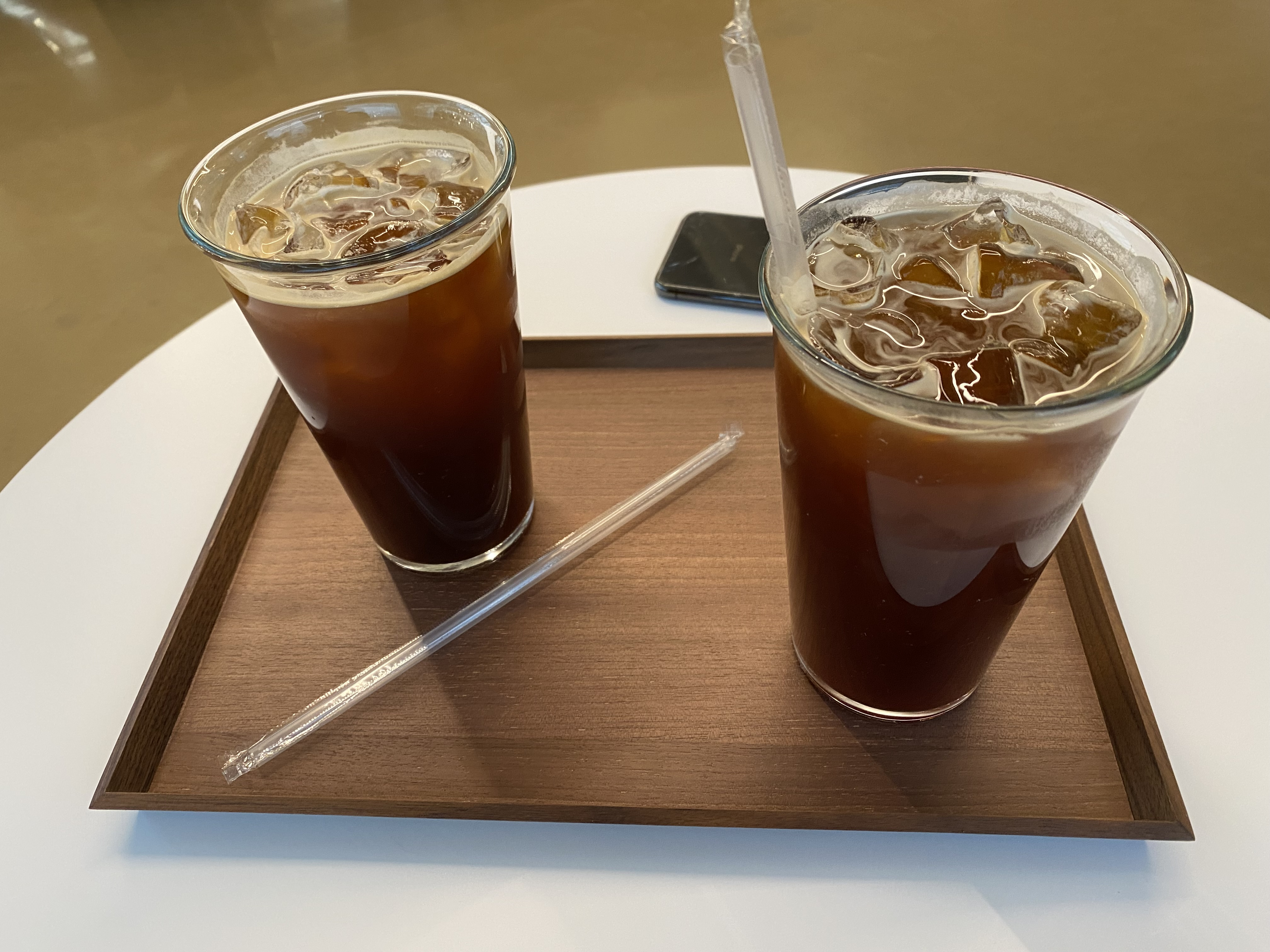 내부에 들어오면 높은 층고로 개방감이 느껴지는 공간이 보인다. 중앙 테이블의 배치와 상들리에가 호그와트에 나오는 학생식당과 흡사해보였다. 커피는 가격대가 좀 있는 편이었다. 아이스아메리카노가 한 잔에 6,000원이다. 아이스아메리카노 두 잔을 시켰는데, 산미 있는 것과 없는 것 중 원두의 종류를 선택할 수 있었다. 위치가 외지긴 했지만 그만큼 조용하고 높은 층고로 넓은 공간감을 느낄 수 있는 장소인 것 같다.