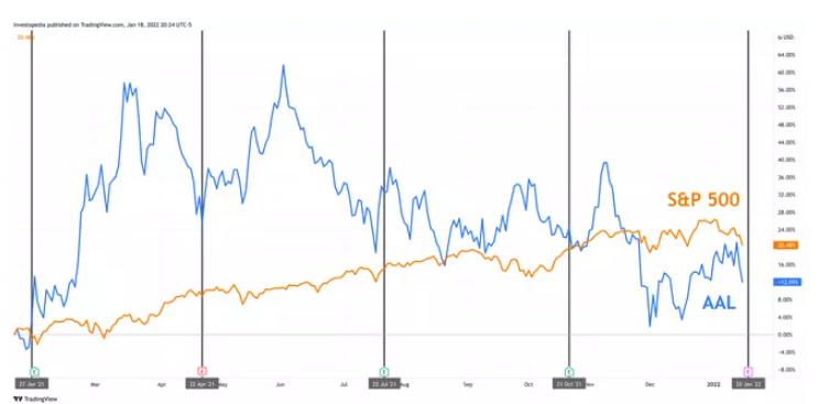 아메리칸 에어라인의 주가는 지난 1년 동안 낮은 수익률을 보였다. 주식은 11월 중순까지는 아웃퍼폼했지만, 코로나바이러스의 오미크론 변종 확산에 대한 우려가 커지면서 시장에 급격히 뒤쳐지기 시작했다. 그 결과 2022년 1월 18일까지 12개월 동안 아메리칸 에어라인의 주식은 S&P 500의 총 수익률 20.5%보다 낮은 12.1%의 총 수익률을 제공했다.