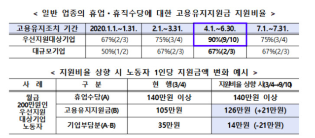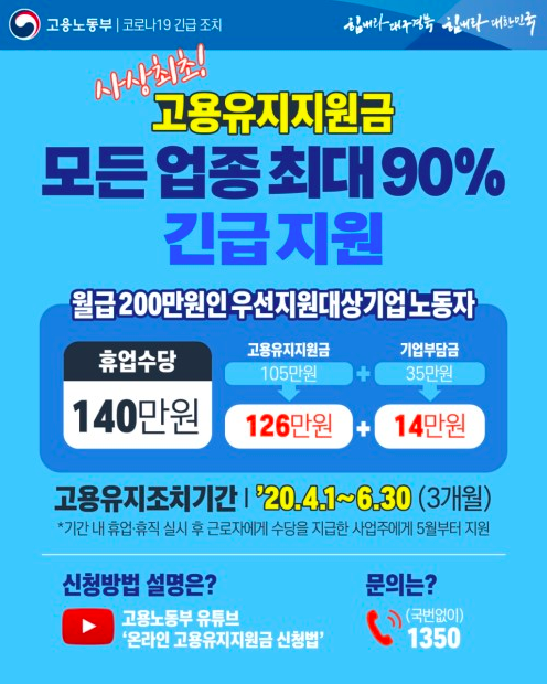이를 위해 고용노동부에서 사업운영이 어려운 중소기업의 사업주들을 대상으로 코로나 피해를 줄이고 고용안정을 유지하기 위해 고용유지지원금 지원자격 요건을 대폭 낮추고 혜택을 늘렸는데요, 이번 개정안으로 4-6월 동안 고용유지지원금 비율을 90%까지 올린다고 합니다.