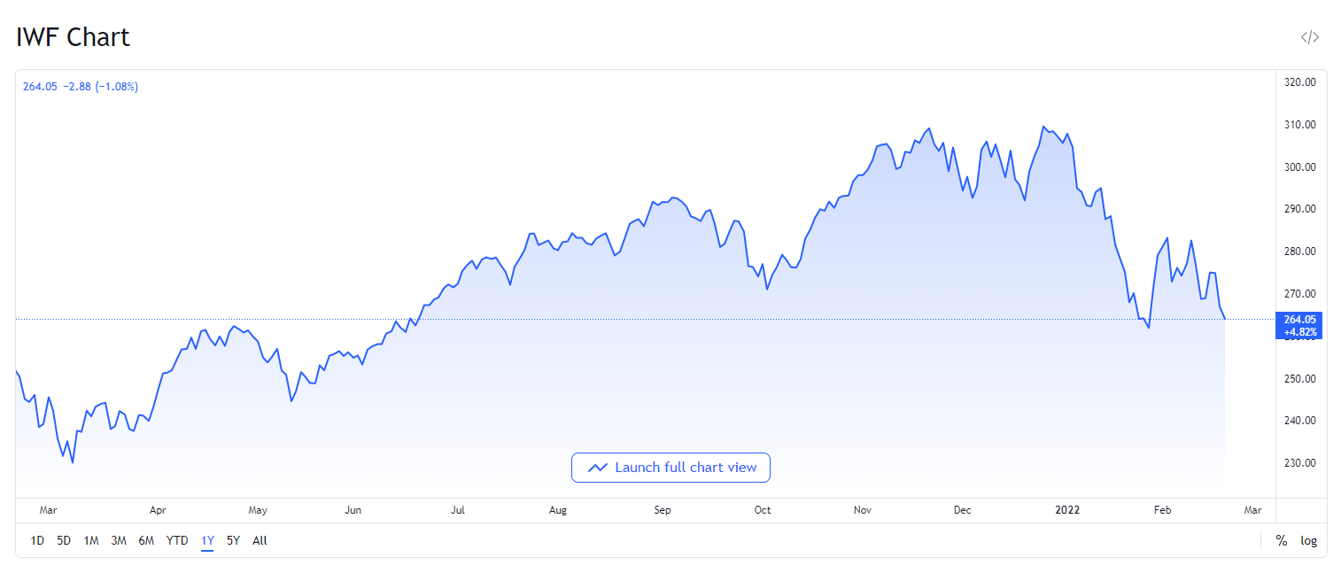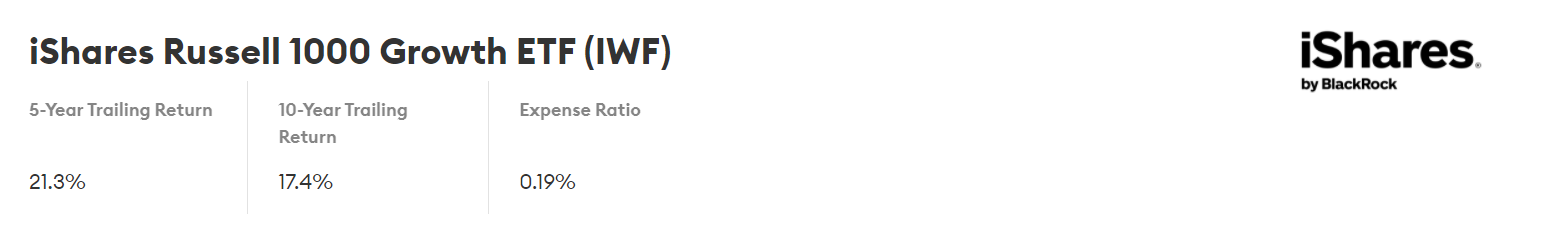 iShares Russell 1000 Growth ETF는 미국의 대형 및 중형 성장 기업을 추종한다. 이 펀드는 중형 기업에 어느 정도 비중을 두지만 대형주 위주로 구성되어 있다. 대부분의 성장주 펀드와 마찬가지로 포트폴리오에는 소수의 회사에만 집중되어 있다. 상위 3개 주식(Apple, Microsoft 및 Amazon)이 펀드의 거의 27%를 차지한다. 2021년 11월 30일 현재 IWF는 0.19%의 수수료율을 가지고 있고 760억 달러의 자산을 보유하고 있다. TTM 수율은 0.50%이다.