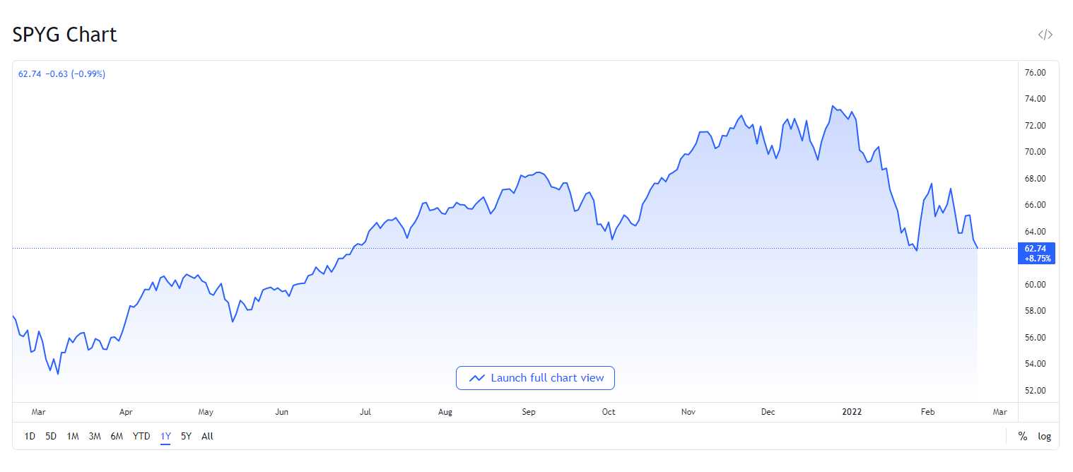 SPDR 포트폴리오 S&P 500 성장 ETF는 S&P 500 성장 지수를 추종한다. 이 지수는 3년 주당 매출 성장률, 12개월 가격 변동률, 현재 가격에 대한 3년 주당 순 변동률 등 세 가지 성장 요인을 고려한다. 현재 SPYG는 242개 종목으로 구성되어 있고 P/E 비율은 29 미만이다. 2021년 11월 30일 기준으로 이 펀드의 운용자산은 156억 달러이고 비용 비율은 0.04%이다. TTM 수율은 0.64%이다.