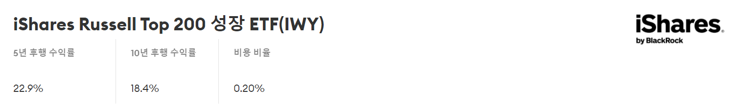 iShares Russell Top 200 Growth ETF는 Russell 3000 지수 에서 가장 큰 200개 기업을 추적하는 Russell Top 200 Growth Index 지수를 추종한다. IWY는 2021년 11월 30일 현재 109개 종목만 보유하고 있다. 펀드의 운용자산은 47억 달러이며 수수료율은 0.2%이다. TTM 수율은 0.53%였다.