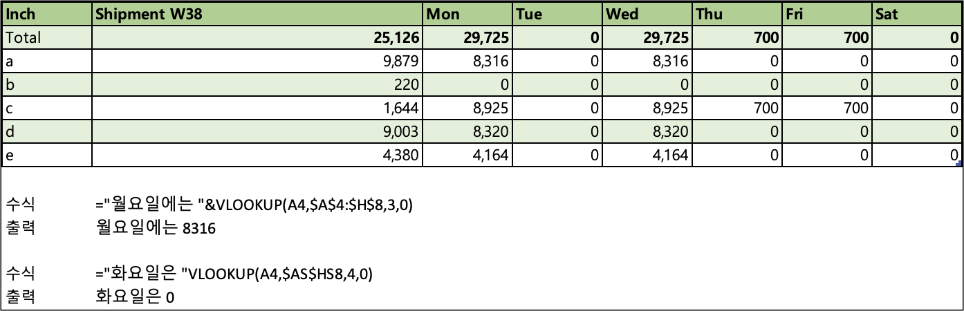 수식 = "화요일은"&VLOOKUP(찾을 값, 범위, 행 0)으로 입력