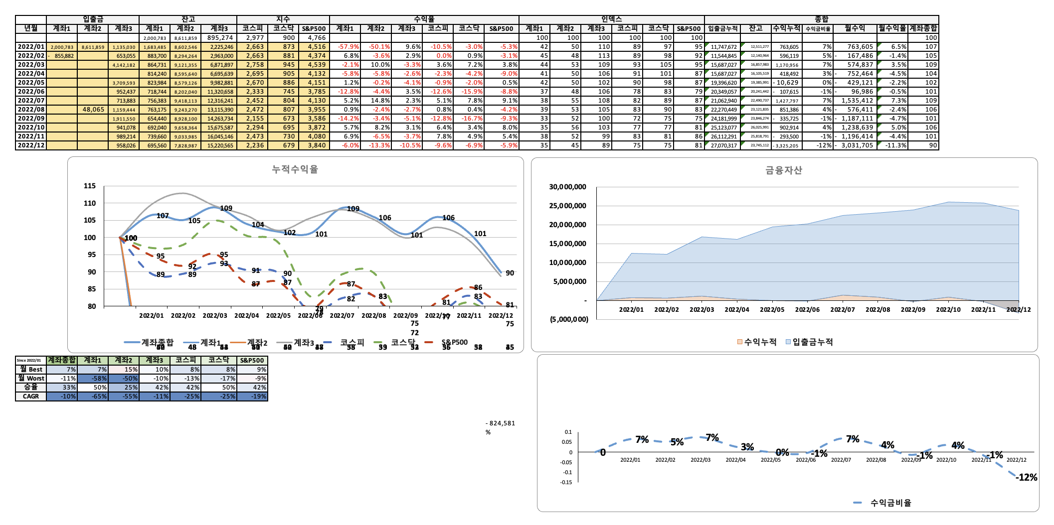 12월 말 기준, 세 계좌 모두 마이너스 수익률을 기록했다. 물론 현재 5월달 기준으로는 테크주 위주로 많이 회복하여 손익분기를 넘었지만 12월말에는 평균 전년대비 -10%의 수익률을 기록했다. 동기간의 코스피, 코스닥, S&P 500 수익률은 각각 -9.6% -6.9% -5.9%으로, 내 계좌보다 선방한 수치를 나타냈다. 내 계좌의 하락폭이 컸던 이유는 아무래도 테크, IT주의 비중이 높고, 개별 종목이 세부적으로 분산되어 있지 않아 구글의 큰 하락으로 인해 낮은 수익률을 기록한 것으로 나타났다.
