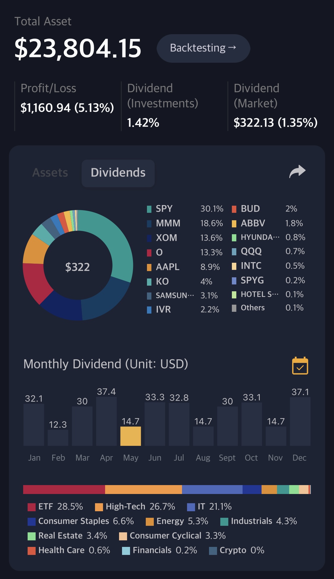 더리치 어플로 결산해본 배당률로는 작년말 대비 배당률이 더 감소한 것으로 나타났다. 그럴만도 한게 2022년에는 고정적으로 SPY와 APPL을 한 주씩 매수했고, 나머지 종목들은 자금 상황에 맞게 매수했던 터라 배당률이 더 내려갈 수 밖에 없었다.