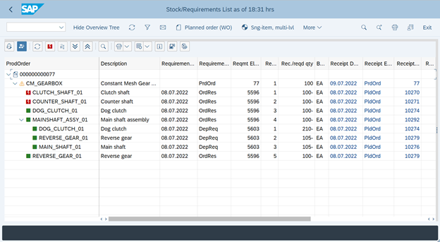 ' Show Overview Tree’ ' 버튼을 클릭하면 그림 2와 같이 'Order Report'가 표시된다. 주문에 필요한 모든 구성 요소를 표시할 수 있다. 구성 요소와 해당 입고 요소를 표시하는 다단계 보고서이다. 주문 보고서는 조립품 생산 또는 구성 요소 조달의 잠재적인 문제를 파악하는 데 도움이 될 수 있다. 거래 코드: MD4C를 사용하여 주문 보고서를 실행할 수도 있다.