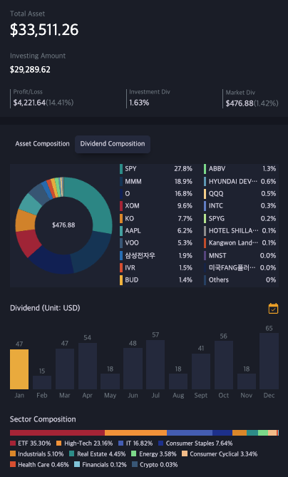 배당률은 작년말 대비 증가한 것으로 나타났다. 아무래도 개별종목을 고배당주로 사 모으기도 했고, 기존 테크주 위주의 포폴에서 ETF 위주의 포폴로 변화한 영향이 큰 듯하다.