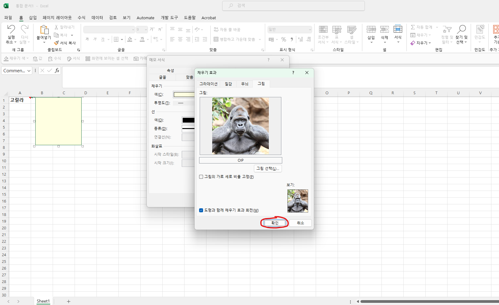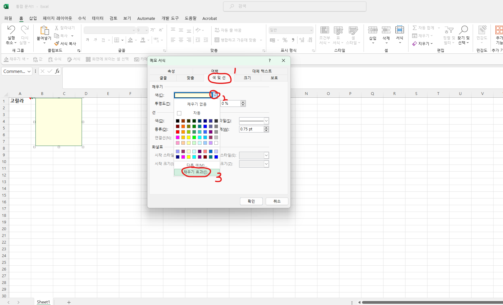 3. 메모 서식 접속 -> 색 및 선 클릭 -> 색 옵션의 채우기 효과 클릭