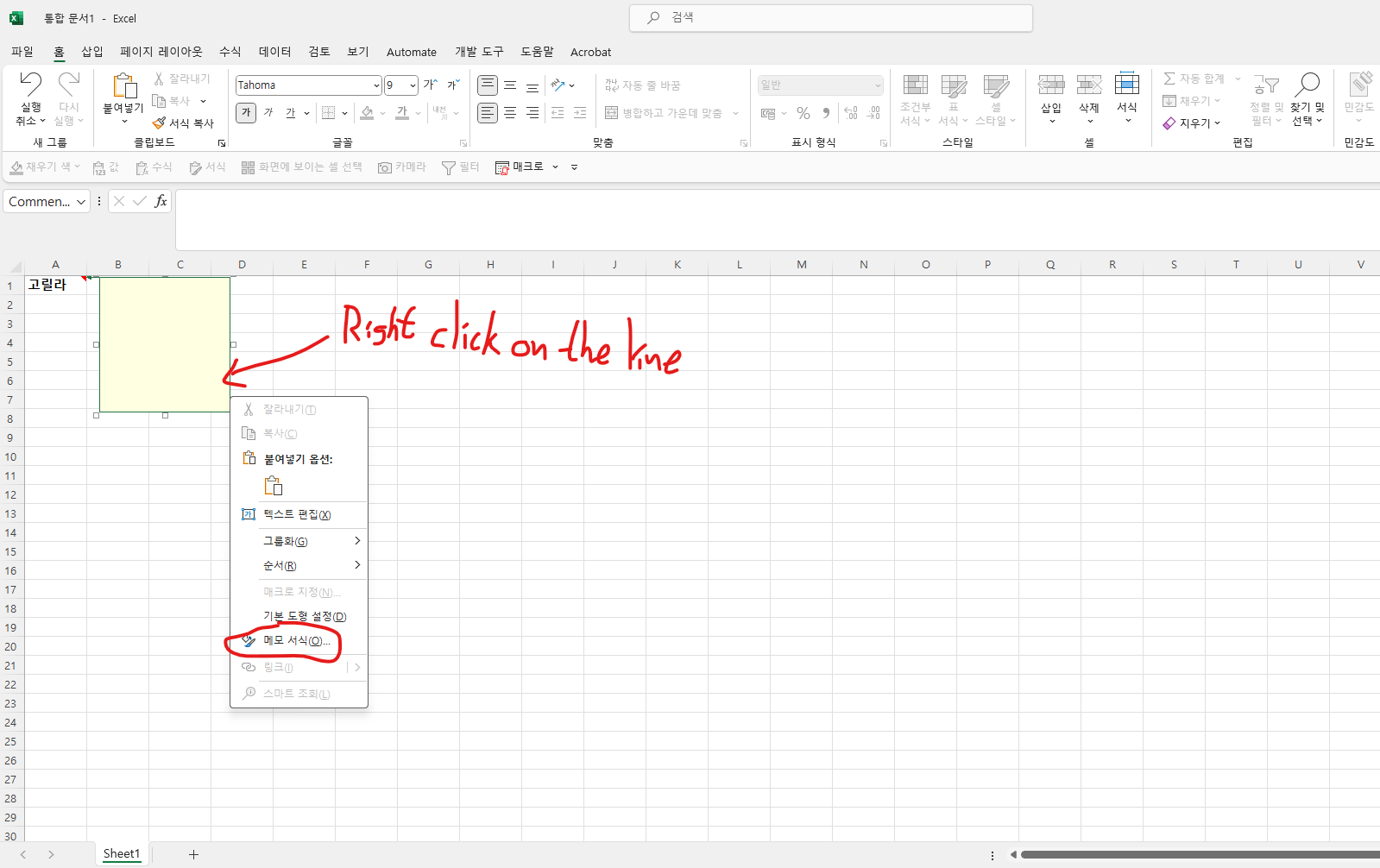 2. 생성된 메모의 모서리 부분에 커서를 올리고 우클릭 -> 메모 서식 클릭