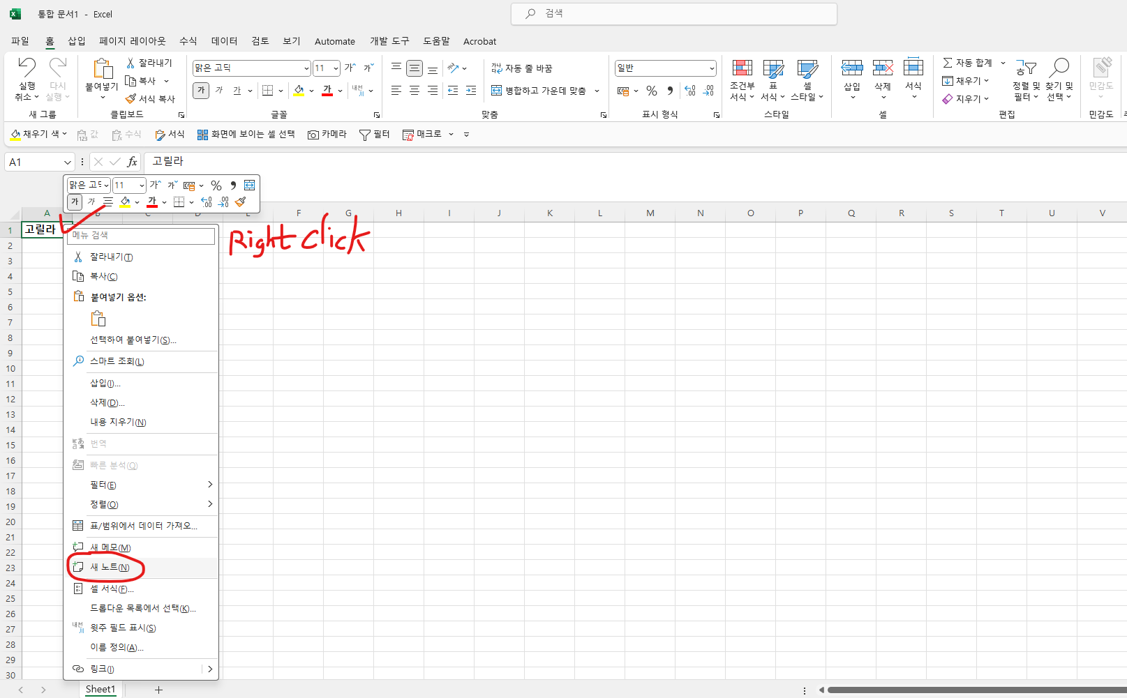 1. 이미지 파일을 넣고자 하는 셀 우클릭 -> 새 노트 생성