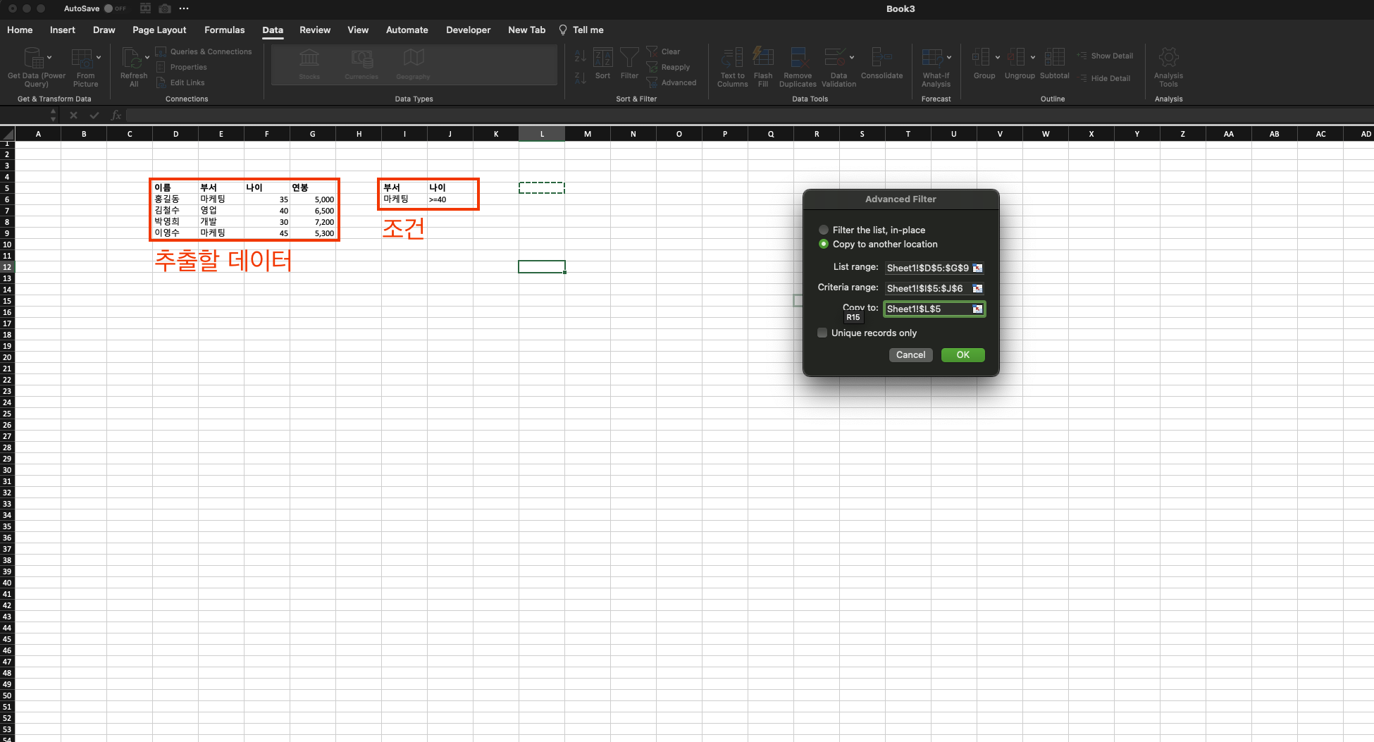 - 필터 옵션 선택: '지정한 위치에 필터링 결과 복사'를 선택하여 원본 데이터와 다른 위치에 결과를 복사할 수 있다.