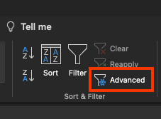 - 고급 필터 메뉴 열기: 상단 메뉴에서 데이터 탭을 선택한 다음, 정렬 및 필터 그룹에서 고급을 클릭한다.