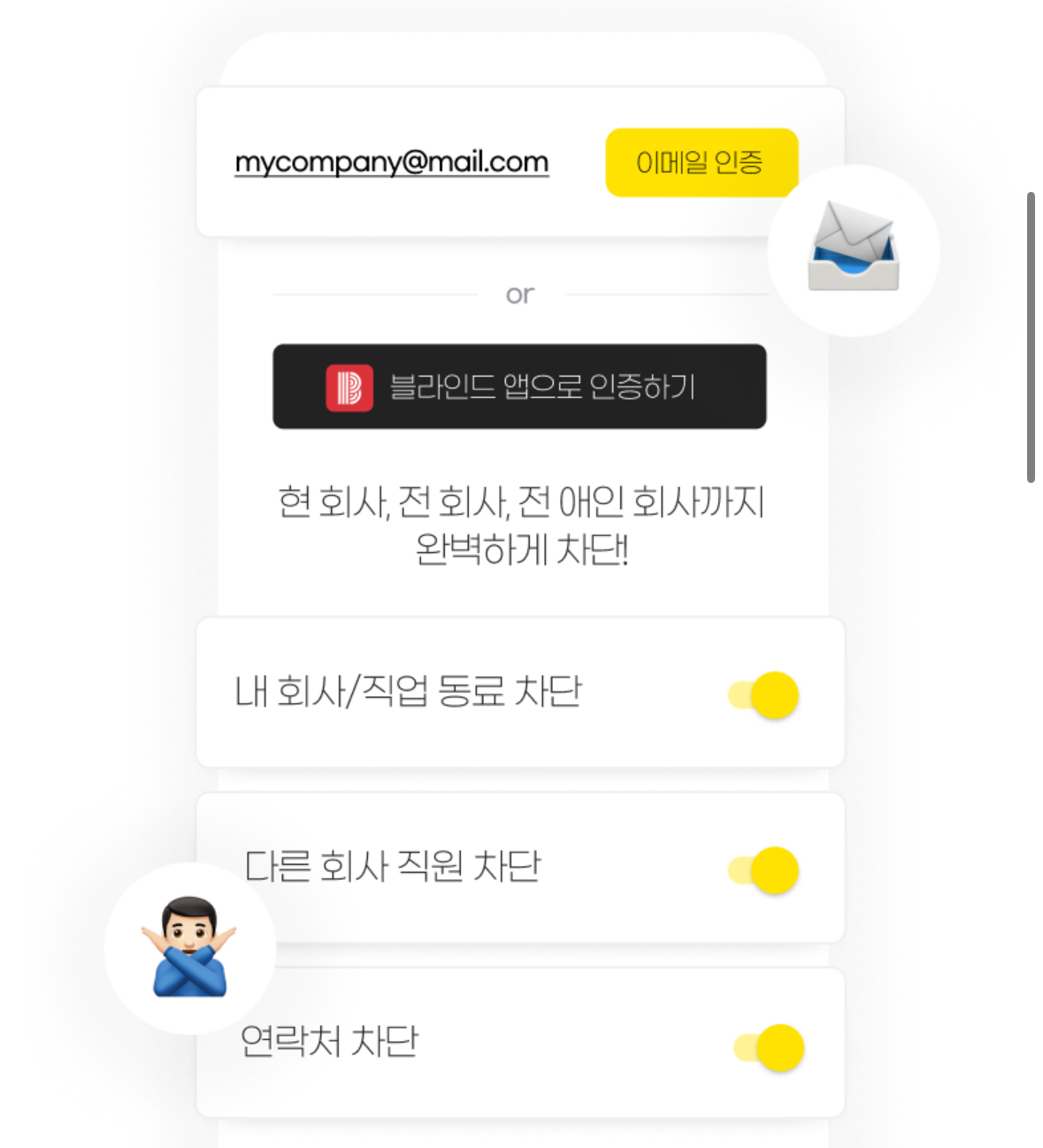 앱에서 회사 사람을 만날까 봐 걱정되나요? 블릿에서는 전화번호 기반 회원 차단 외에도 회사 정보를 기반으로 특정 회사 회원을 차단할 수 있다. 현 회사, 전 회사, 심지어 전 애인의 회사까지 모두 차단하고, 지인을 만날 걱정 없이 마음 편히 블릿을 즐길 수 있다.