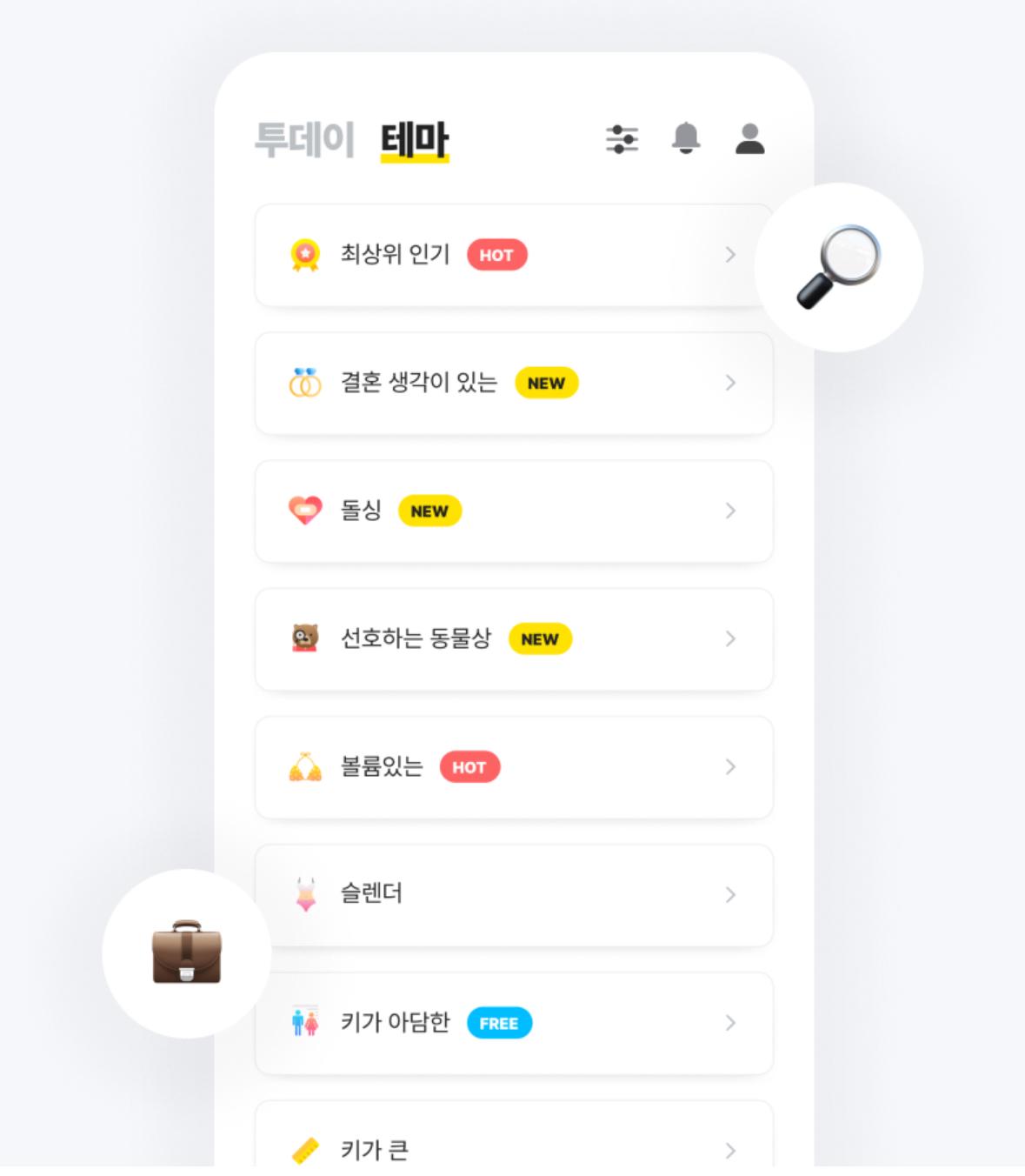 블릿은 다양한 추천 테마를 제공해 사용자가 원하는 조건의 상대를 쉽게 찾을 수 있다. 키, 체형, 학력, 직장, MBTI, 종교, 돌싱, 결혼 생각 등 20개 이상의 테마를 통해 나에게 딱 맞는 이상형을 만나보자.