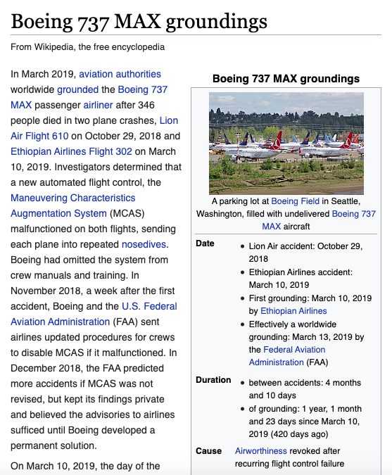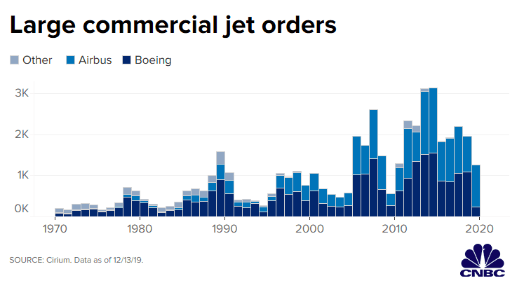 그러나 작년에 보잉의 737맥스 기종이 인도네시아, 에티오피아 등에서 잇달아 추락하며 300명 이상이 사망했고, 사상 초유의 생산중단 조치를 받았다. 2018년 보잉의 매출 대부분은 737 맥스 기종에서 나왔다. 이 모델에 대한 운행중단조치는 그야말로 치명적인 것이다.