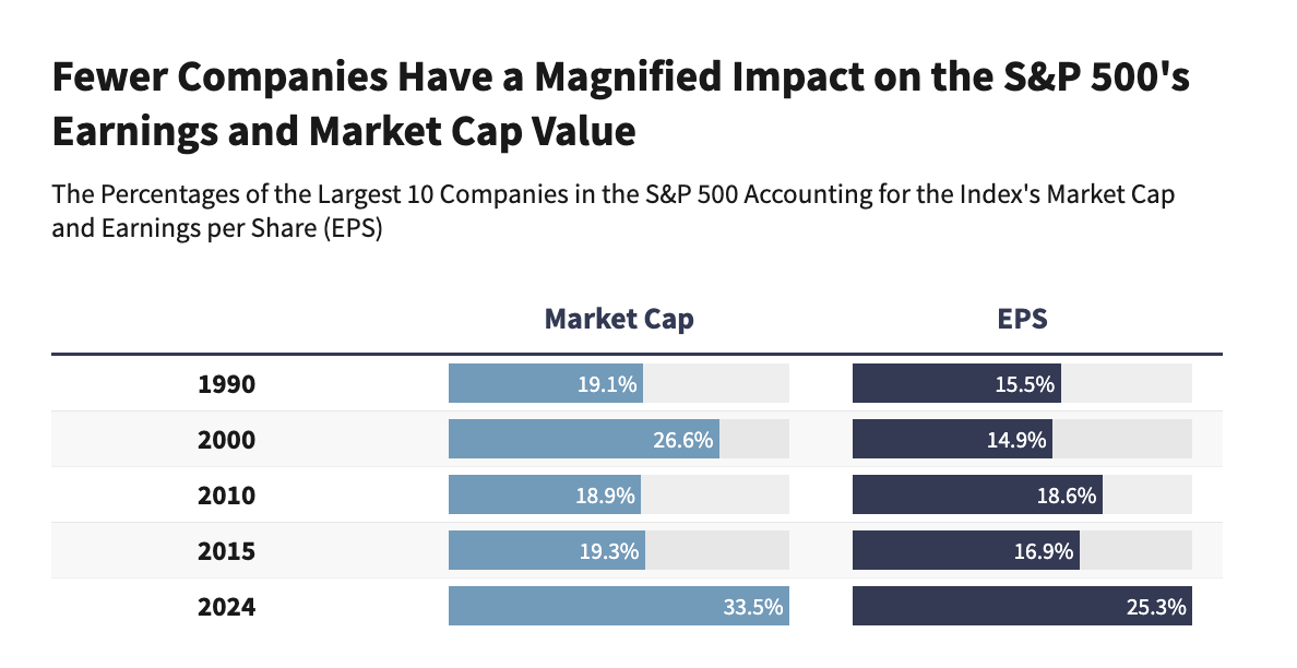 과거 S&P 500은 산업, 에너지, 금융 등 다양한 업종으로 구성됐지만, 최근에는 소수의 기술 기업들이 지수 상승을 주도하고 있다. 2025년 기준, 구글, 애플, 아마존, 메타, 마이크로소프트, 엔비디아, 테슬라 등 ‘매그니피센트 세븐’이 지수 시가총액의 약 33.5%를 차지한다. 이는 투자 다변화 측면에서 주의가 필요한 부분이다.