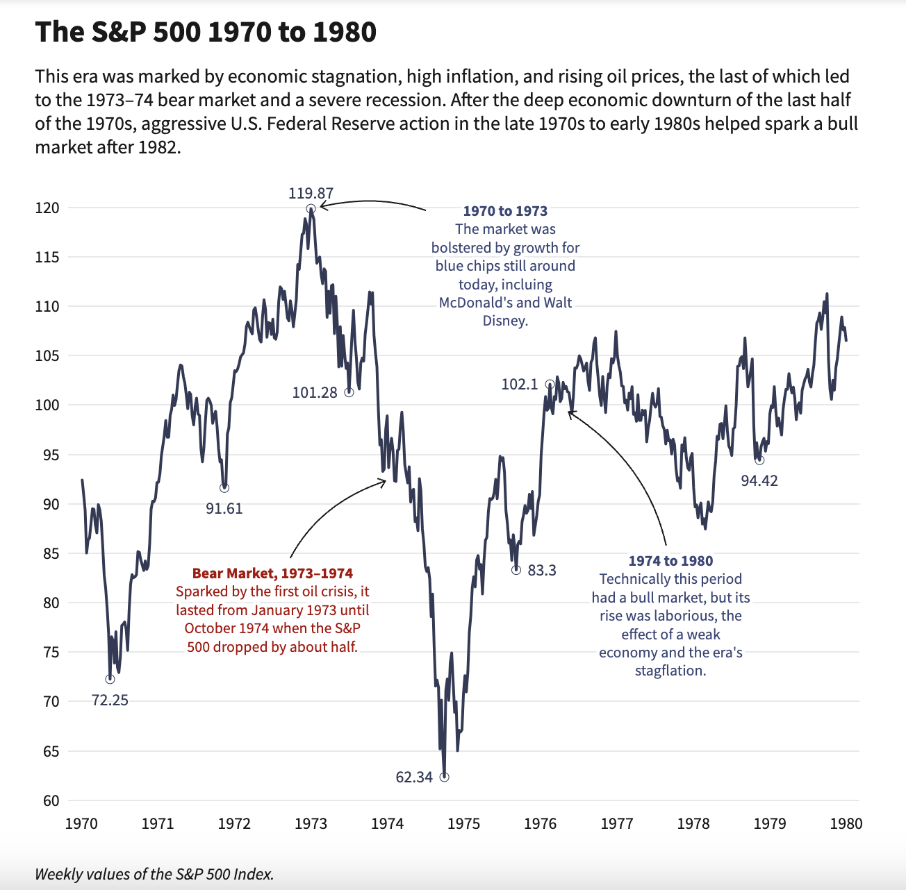 - 1970~1981년, 스태그플레이션: 높은 인플레이션과 경기 침체가 겹쳐 지수가 크게 하락했다.