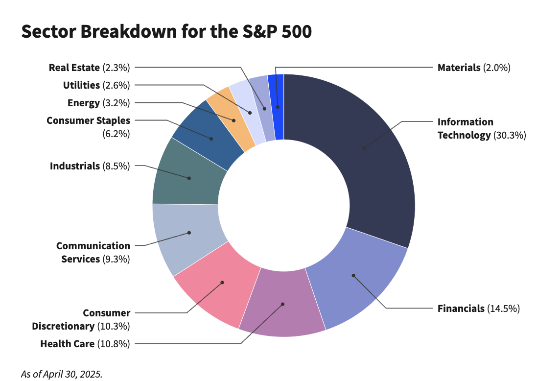 S&P 500은 미국을 대표하는 500개 대형 상장기업의 시가총액 가중 지수이다. 이는 단순히 주가가 높은 기업에 더 큰 영향을 주는 방식이 아닌, 기업의 전체 시장가치(주가 × 발행 주식 수)에 따라 지수에 반영된다. 덕분에 애플, 마이크로소프트, 아마존 등 거대 기업들이 지수에서 차지하는 비중이 높다.