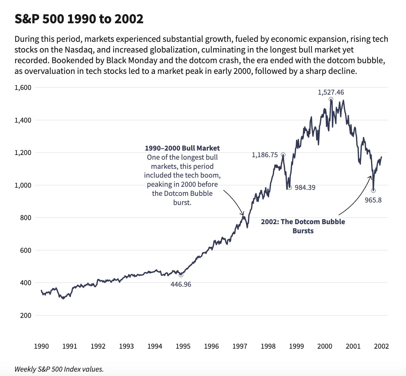 - 1990~2002년, 인터넷 버블: 닷컴 붐과 이후 붕괴로 지수가 급격한 변동을 겪었다.