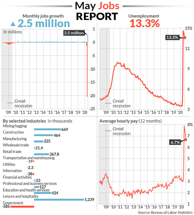 The U.S. regained 2.5 million jobs in May and the unemployment rate fell to 13.3%, confounding Wall Street expectations for another big wave of layoffs and...