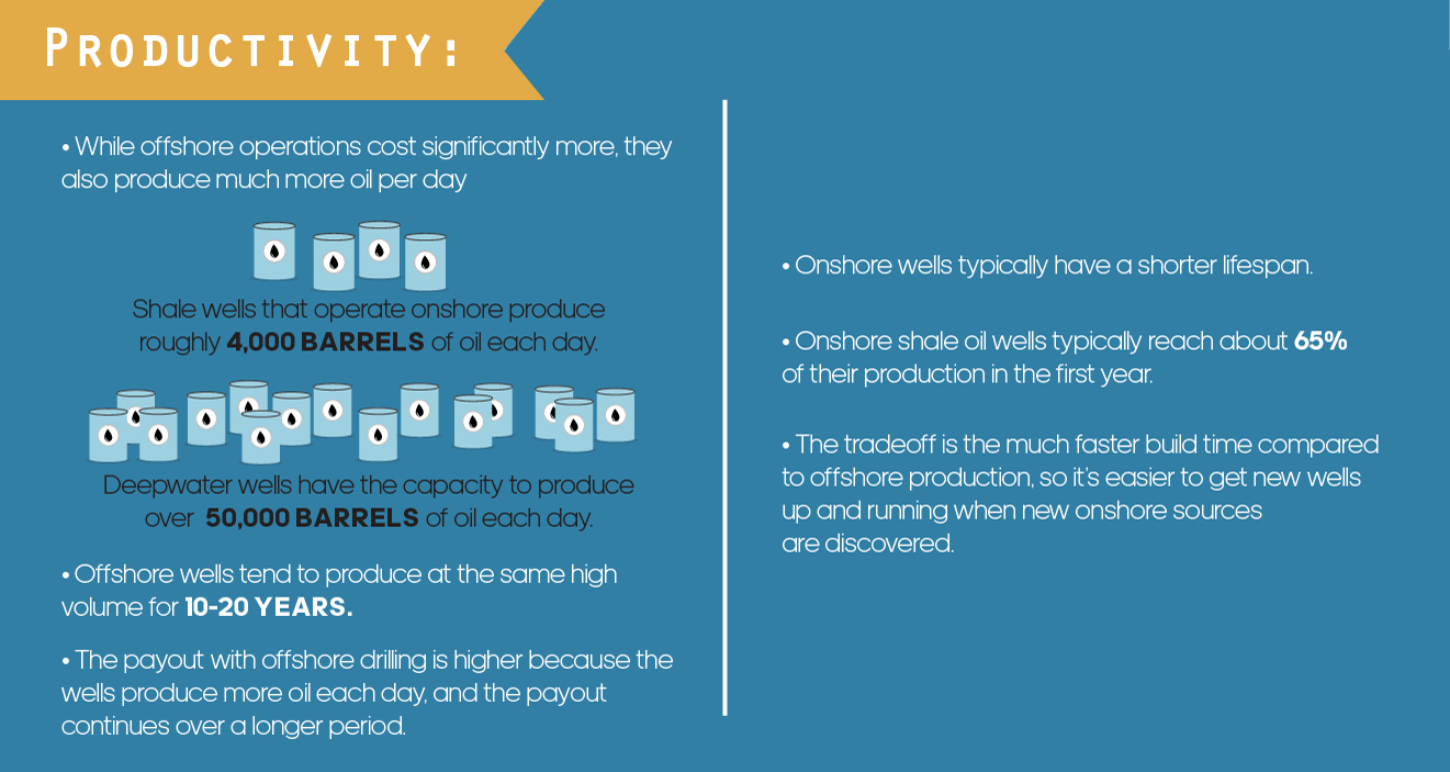 오프쇼어 드릴링의 채취 비용이 훨씬 높은만큼, 일일 생산량도 훨씬 높다.
