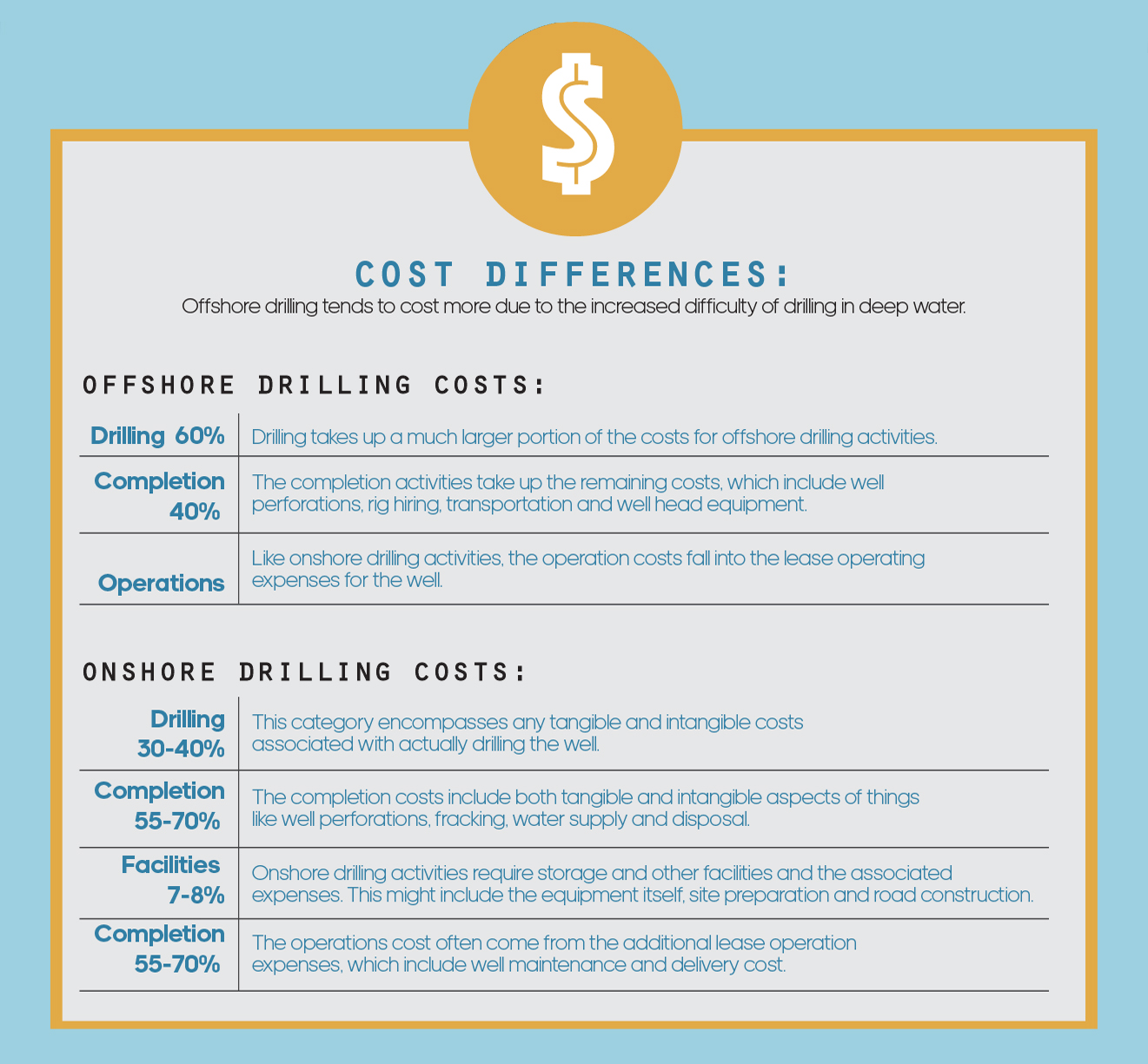 오프쇼어 드릴링은 드릴링의 난이도가 높기 때문에 전체 채취 비용 중 드릴링의 비중이 60%로 매우 높다. 굴착이나 유정에 설치되는 장비, 운송에 사용되는 비용 등이 나머지 40%를 차지한다.
