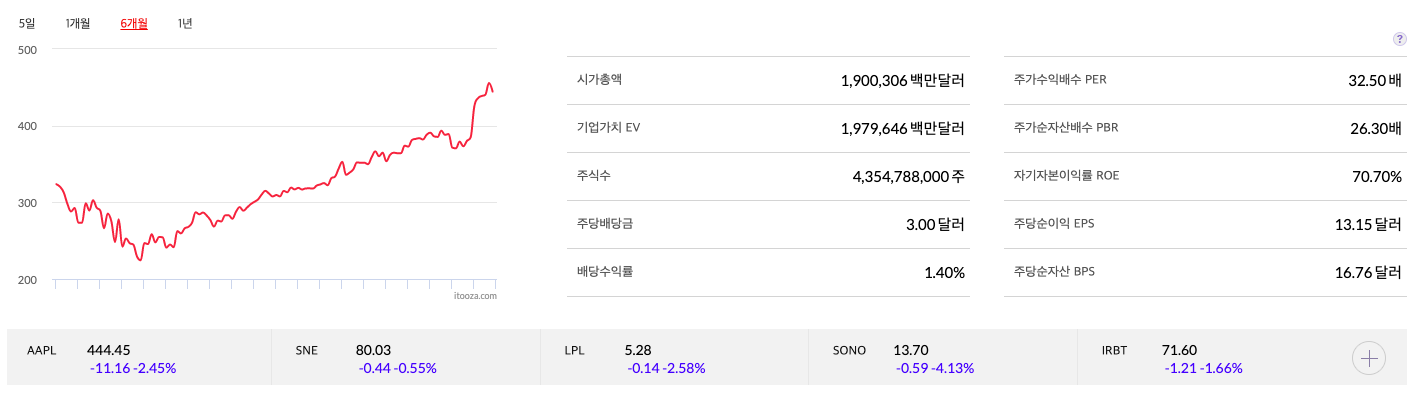 애플의 시가총액은 1.9조달러까지 치솟았다. PBR은 26배까지 올랐다. 이는 애플이 문을 닫고 순자산을 다 팔았을 때의 가치가 시총의 1/26 밖에 안된다는 이야기이다. 즉, 매우 고평가 되어 있다는 뜻이 된다.