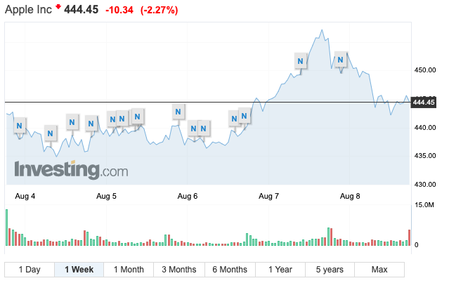 애플의 마지막 액면분할은 2014년이었다. 당시 애플의 주가는 600달러 수준이었는데 이를 1/7로 액면분할하여 92달러 선에서 거래되도록 했다. 이번 액면분할 소식으로 8월 초 애플의 주가는 급등했다가 조정을 받는 모양새이다.