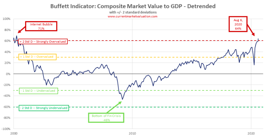 버핏 지수는 보통 0.7-0.8 사이의 값을 유지하는데, 1이 넘으면 국내 총 생산에 비해 상장 주식들의 값이 비싸다는 것을 의미하기 때문에 증시가 과열됐다고 해석한다. 과거 닷컴 버블, 모기지 버블 때 버핏지수는 각각 140%, 100%을 기록했었다.