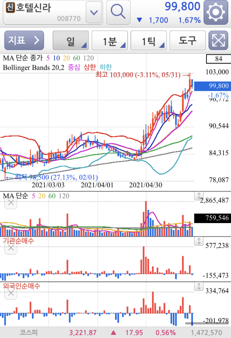 호텔신라는 한옥호텔 추진과 더불어 백신 접종률이 오름에 따라 여행수요가 점점 증가할 것으로 생각되어 면세점 사업과 더불어 시너지가 날 것으로 예상되어 매수했다.