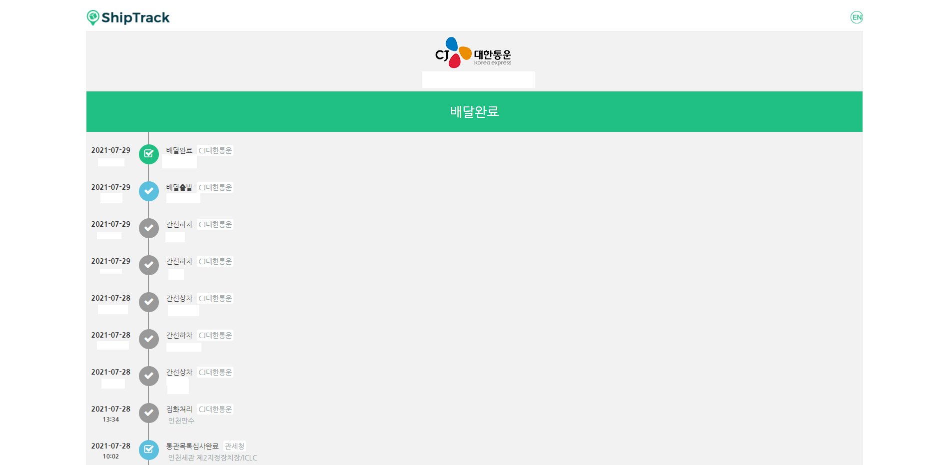 여기서 통관목록심사완료가 떠야 물품이 반출이 되고, 국내 택배사가 물건을 수취하여 배송이 나가게 된다.