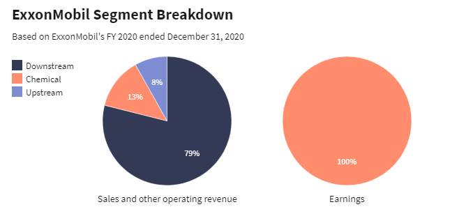 화학 부문은 ExxonMobil에서 2020년에 이익을 창출한 유일한 사업이다. 수익은 231.6% 증가한 20억 달러를 기록했다. 그러나 해당 부문의 매출 및 기타 영업 수익은 2019년 대비 15.8% 감소한 231억 달러로 전체의 약 13%를 차지했다.