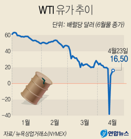 미국의 셰일 오일을 시작으로 중동, 러시아, 미국이 각자의 셈법으로 증산을 해버려서 기름값이 많이 떨어졌었는데 여기에 신종 코로나 바이러스로 인해 실물경제 침체 우려로 원유의 가격이 급등과 급락을 반복하고 있다.
