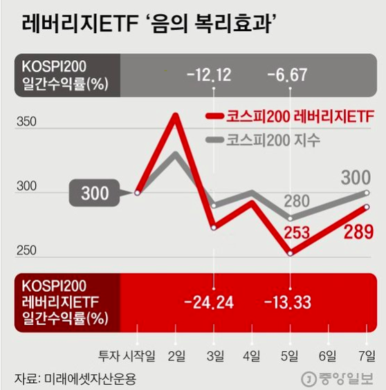 하지만 코스피 레버리지 ETF라면 1일차에 360, 2일차에 288, 3일차에 230.4 4일차에 276.48로 일반 코스피보다도 못한 회복을 보이게 된다. 그렇기 때문에 횡보장에서도 손실을 입을 확률이 큰 것이다.