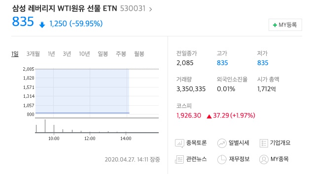 매일 30%씩 오르내리는 변동성으로 인해 시세차익을 얻기 위해 투자 수요가 크게 늘어났는데 원유는 증권시장에서 ETN(Exchange Traded Note) 상품으로 판매가 된다. 즉, 증권사가 직접 기초지수의 수익률에 연동하는 수익을 지급하는 것을 약속하는 것으로 발행하여 판매되는 상품으로 현물 주식에는 없는 많은 리스크가 있다.