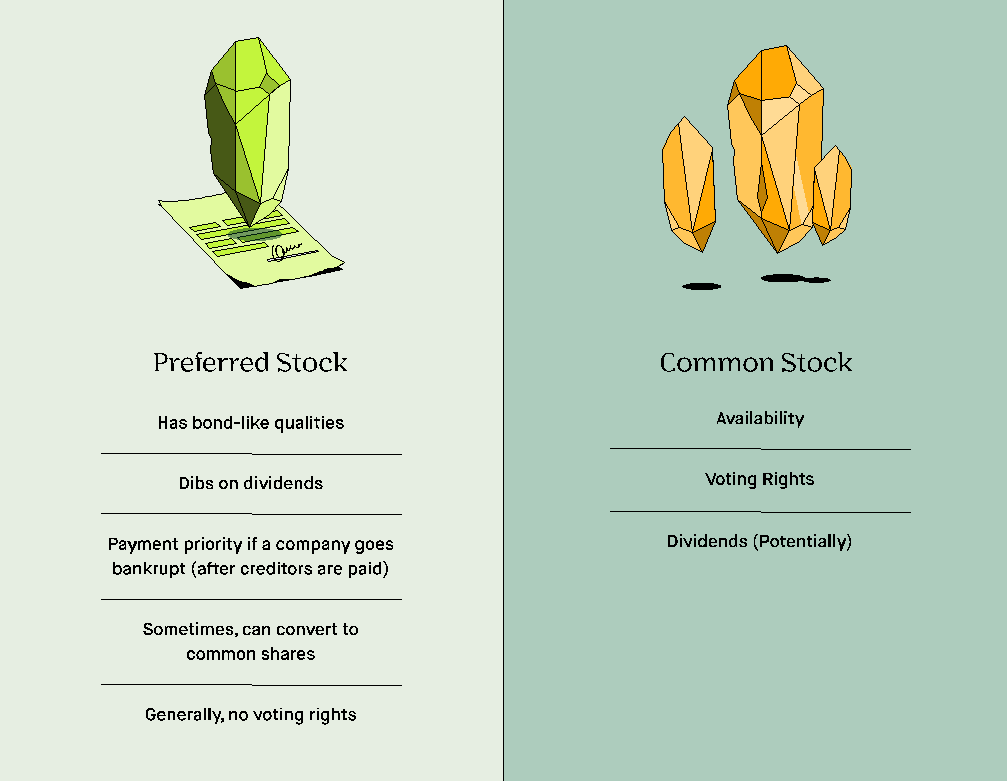 우선주와 보통주 사이에는 많은 차이점이 있다. 가장 큰 차이점은 우선주는 일반적으로 주주에게 의결권을 부여하지 않는 반면 보통주는 일반적으로 소유주당 1표로 의결권을 부여한다는 것이다. 많은 투자자들이 우선주보다 보통주에 대해 더 익숙하다. 두 가지 유형의 주식 모두 회사의 일정 지분에 대한 소유권을 나타내고 시세차익을 얻기 위해 매매할 수 있는 투자수단이다.