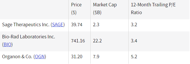 이들은 12개월 후행 P/E이 가장 낮은 의료주이다. 이익은 배당금 및 자사주 매입의 형태로 주주들에게 반환될 수 있기 때문에 낮은 P/E 비율은 생성된 1달러의 이익에 대해 더 적은 비용을 지불한다는 것을 나타낸다.