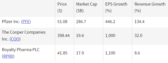 최근 분기별 YOY 수익 성장률과 분기별 YOY 주당순이익(EPS) 성장률의 50/50 가중치를 기반으로 기업에 점수를 매기는 방식으로 측정한 가장 빠르게 성장하는 헬스케어 섹터의 주식이다. 매출상승과 영업이익은 모두 회사의 성공에 중요한 요소이다. 따라서 오직 하나의 요소로만 성장 측정 기준을 판단하여 회사 순위를 지정하면 해당 분기의 회계 오류(세법 변경 또는 구조 조정 비용 등)에 영향을 받기 쉬우며 이로 인해 측정값이 정확하지 않을 수 있다. 분기 EPS 또는 매출 성장률이 2,500% 이상인 기업은 특이값으로 제외했다.