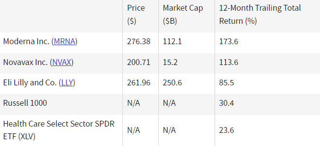 COVID-19 치료제에 대한 이러한 수요 급증에도 불구하고 의료주는 전체 시장을 하회했다. 헬스케어 섹터를 대표하는 상장지수펀드(ETF)인 Health Care Select Sector SPDR ETF(XLV)를 보면 알 수 있다. XLV의 총 수익률은 지난 12개월 동안 23.6%로 2021년 11월 24일 현재 Russell 1000의 총 수익률 30.4% 보다 낮다.