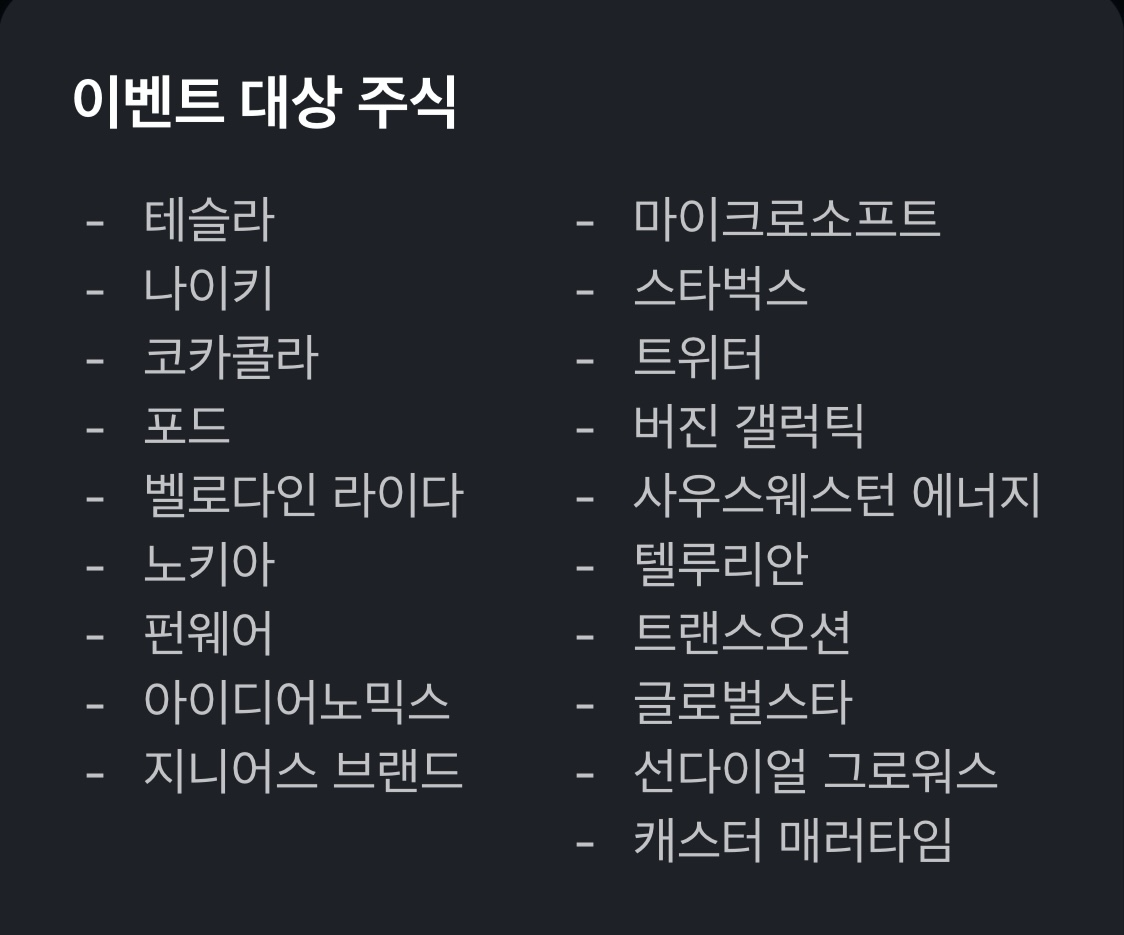 토스에 가입되어 있더라도 해외주식 계좌를 개설한 이력이 없다면 참여가 가능하다. 이벤트로 지급되는 주식 중 상당히 고가의 주식도 있다. 먼저 테슬라는 현재 1주당 1000달러에 육박한다. 그리고 마이크로소프트도 300달러대이니 비싼 편이다. 솔직히 나이키나 스타벅스만 받아도... 이득이다.
