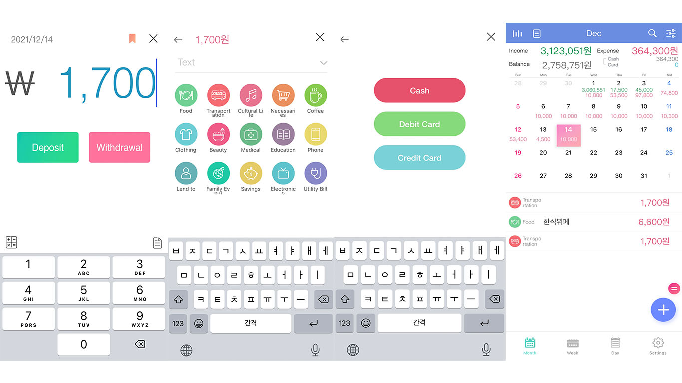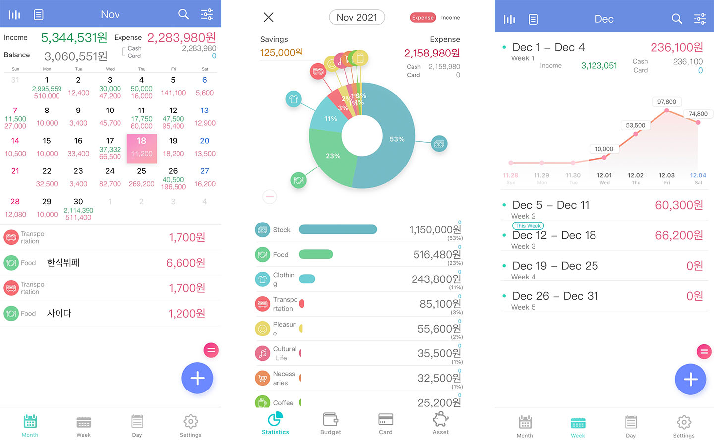 요즘은 카드사에 연동되어 편리하게 관리 가능한 자산관리 앱이 많이 나와서 딱히 이 어플이 최고라고 말하기는 어렵다. 나는 이 어플로 매번 돈을 쓸 때 마다 수동으로 기입하고 있다. 방법은 간단하다. 지출한 날짜를 클릭 후 금액 기입, 그 후 아이콘을 클릭하여 카테고리를 분류해주는 것이다. 기록한 데이터는 어플로 그래프도 볼 수 있고, 엑셀 파일로 출력할 수도 있다.