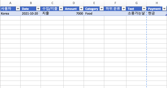 이런식으로 출력한 데이터를 피벗테이블화 시키면 카테고리 별 합계는 물론 수입/지출별 합계, 월별 합계 등 다양한 데이터를 출력하여 볼 수 있다. 만약 가계부를 쓸 때 습관을 들여 상세한 각주를 달아놨다면 금상첨화다. 해당 항목을 클릭 시 이렇게 자세하게 볼 수 있기 때문이다.