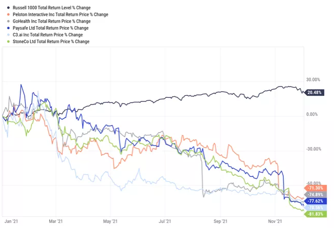 2021년 12월 3일 장마감을 기준으로 러셀1000(Russell 1000)지수에서 YTD 총 수익률이 가장 낮은 하위 5개 종목이다. 러셀 1000지수는 시가총액을 기준으로 미국에서 거래되는 1000대 기업으로 구성된 지수로, 러셀 1000지수에 편입된 종목의 시총 합은 전체 미국 주식 시장의 시총에서 약 92%를 차지한다. 따라서 미국 주식 시장 전체, 특히 대형주에 대한 유용한 지표로 볼 수 있다.