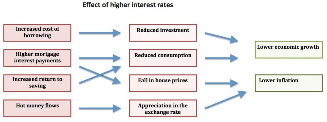 더 높은 이자를 감당할 수 없거나 원하지 않는 사람들은 자금 조달과 관련된 프로젝트를 연기한다. 동시에 사람들은 더 높은 이자를 받기 위해 돈을 저축하는 경향이 생긴다. 이로 인해 시장에 유통되는 화폐량이 줄어 인플레이션을 낮추고 경제 활동이 완화된다.
