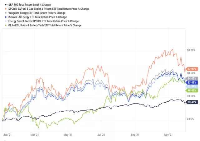 상위 5개 ETF 중 에너지 섹터를 제외한 나머지 1개 ETF도 상품 가격 상승, 특히 리튬 가격 붐의 수혜를 받았다. 리튬은 많은 전기기기에 사용되는 배터리 생산에 사용되는 핵심 금속으로, 특히 올해 판매량이 급증한 전기차(EV)에 전력을 공급하기 위해 대량으로 사용된다.