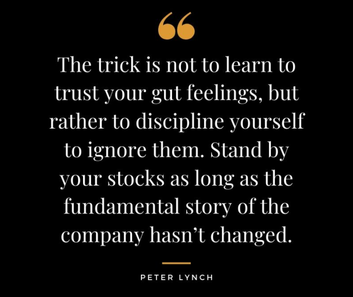 2. 투자의 비결은 당신의 직감을 신뢰하는 법을 배우는 것이 아니라, 그것을 무시하도록 자신을 훈련하는 것입니다. 회사의 펀더멘털이 변하지 않는 한 주식을 계속 보유하세요.